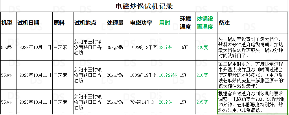 今天是2023年10月11日,今天早上我們的新型550電磁炒貨機(jī)在滎陽市王村鎮(zhèn)汝南路口口香油坊進(jìn)行了測(cè)試試用,測(cè)試物料為白芝麻,用戶壓榨香油用。用戶油坊內(nèi)現(xiàn)有的電磁炒貨機(jī)每鍋可裝芝麻160斤,電磁功率跟我們相同為20千瓦,炒50斤芝麻冷鍋情況下需要32分鐘左右。我們的炒貨機(jī)冷鍋情況下50斤芝麻用時(shí)22分鐘(根據(jù)實(shí)際情況20分鐘即可炒好),今天測(cè)試了三鍋,平均每鍋用時(shí)20分鐘左右,用戶對(duì)我們的炒料效果和效率非常滿意。詳細(xì)測(cè)試數(shù)據(jù)我列了個(gè)表,大家可以看下。